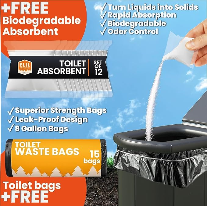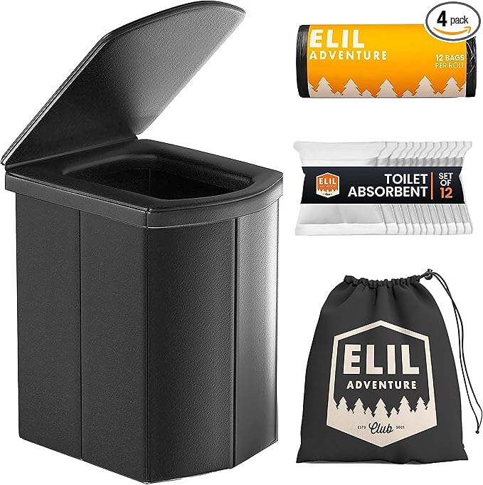 - Camping Toilet Portable Potty for Adults: Portable Potty with a Carry Bag, 12 x Liquid Absorbent Gel and 12 x 8 gallon Camping Toilet Bags