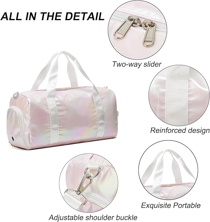 - Multipurpose Duffle Bag: This cute and stylish gym bag with adjustable shoulder straps and detachable hanger buckle, soft and comfortable material, it is spacious enough to be used as gym bag, sports bag, duffel bag, workout bag, weekend bag, overnight bag , swimming bag, beach bag, dance bag, soccer bag, cheer bag, gymnastics bag.