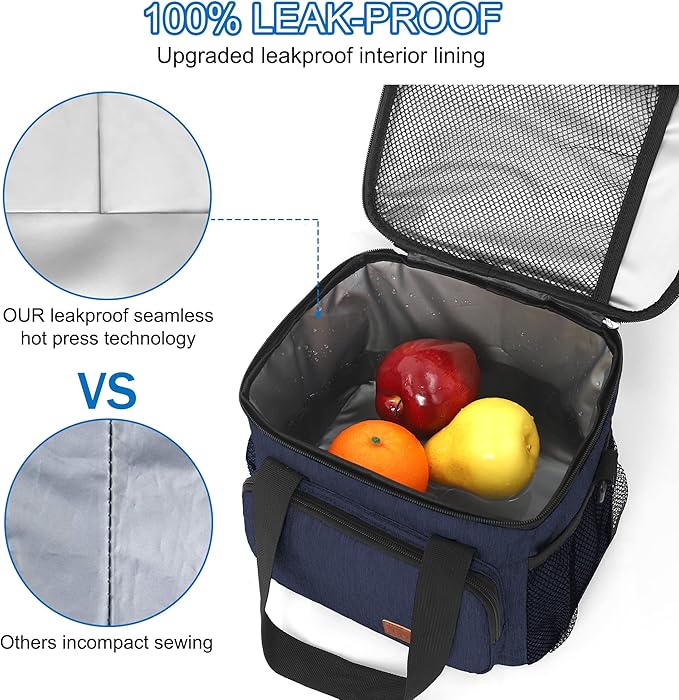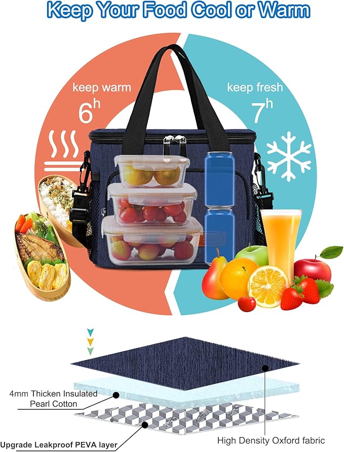 - 【INSULATED & LEAKPROOF】-- The insulated lunch bag with extra Thick Waterproof PEVA Liner, Premium 600D Eco-friendly Oxford Fabric and built-in 4mm EPE foam insulation material retain coldness or warmth, it can keep food stay cold/hot/fresh more than 6 hours. The heat-welded of thermal lunch box seams to guard against leaks and easy to wipe clean with a damp cloth.