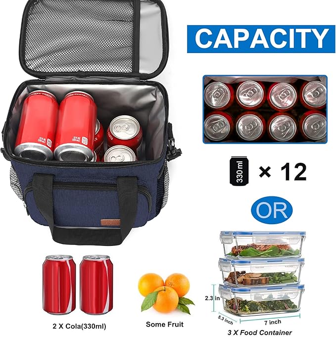 - 【LARGE CAPACITY】 -- The reusable lunch bag with big double zippers compartment is 10”L x 6.7”W x 8”H. The maximum capacity is 8.7, big enough to fit 12 tins of 330ml coke, wide-open square design can easily store your sandwiches, salad, drinks and fruits in this large capacity lunch bag. It can fit all your lunch need whole day and prefect to take foods and snacks with your outdoor activities.