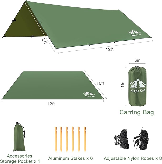 - 【Versatile Tarp】Night Cat Camping Tarp is great matching with Night Cat Camping Hammock Tent.Depending on different outdoor activities,this versatile tarps can be used as hammock rain fly, tent tarp,tent footprint, shelter, awning and so on.With built-in tie loops, the tarp shape of the settings can be adjusted for a variety of uses in different situations to meet your demands.