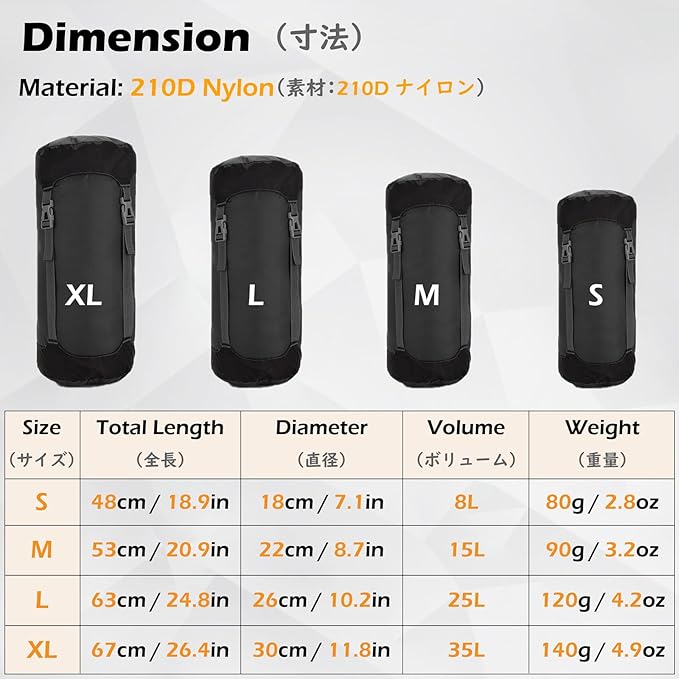 - ✅ MATERIAL - Compression Stuff Sack is made of 210D Nylon material which provides a excellent combination of ultralight, tear-resistant and durability for your sack. The waterproof outer layer keeps the inside absolutely dry to protect your item