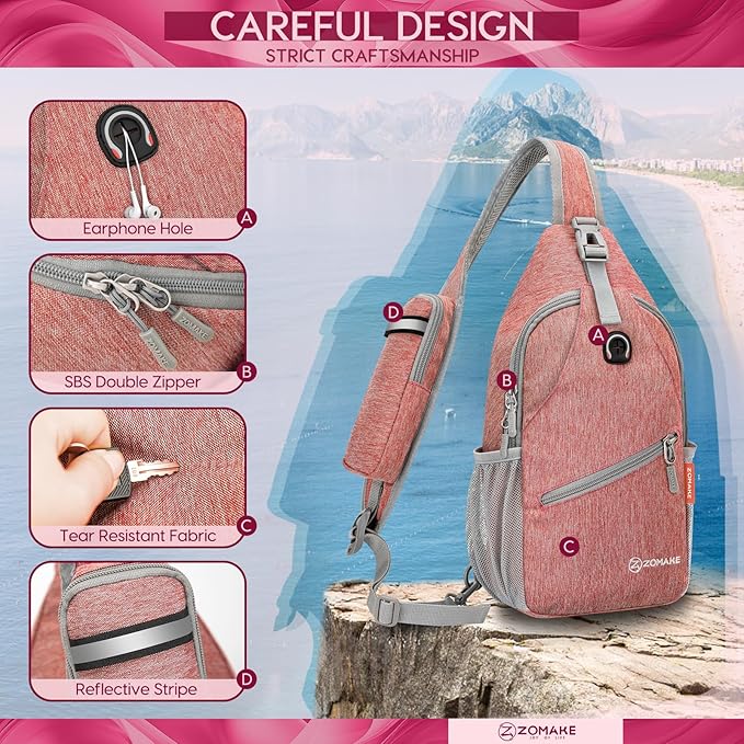 - Practical and Beautiful Crossbody Backpack:The practical and beautiful ZOMAKE sling hiking backpack is the perfect combination of fashion, convenience and performance. The cross chest bag also has a hidden headphone hole on the front, making it easy to access your headphones.This sling bag is the perfect way to stay connected to your favorite music while on the go