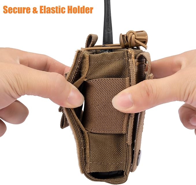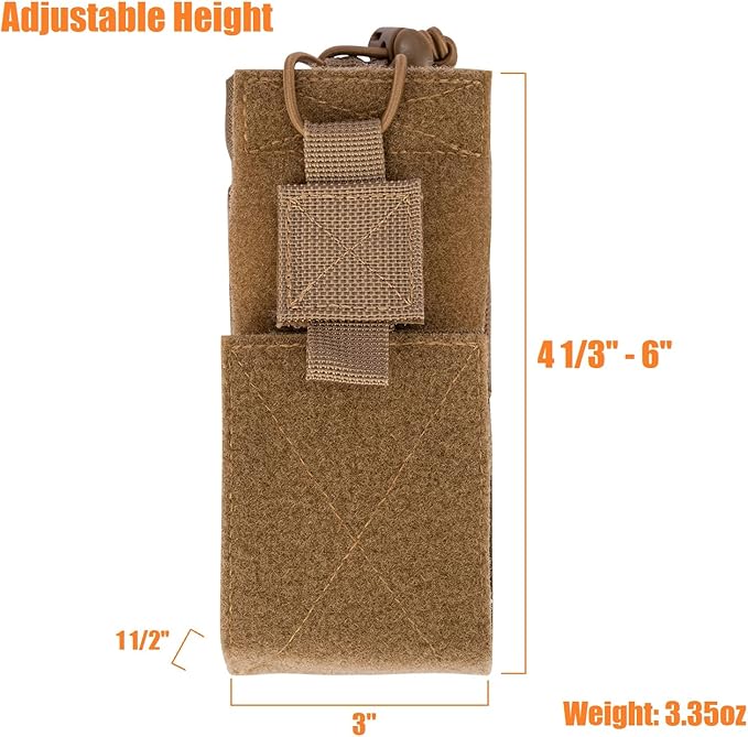 - Quick and easy take on and off, lightweight, durable and adjustable. Hook and loop closure can be released with one hand. The bungee cord can be easily adjusted to securely fix radios/mags of various sizes.