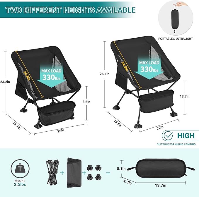 - Built to Stay Put - No Matter the Terrain: Equipped with oversized anti-sinking feet and made with 7075 aviation-grade aluminum alloy, this chair stands firm on sand, grass, or rocky surfaces. It’s ultra-light yet surprisingly sturdy, offering stable seating for adults up to 330 lbs