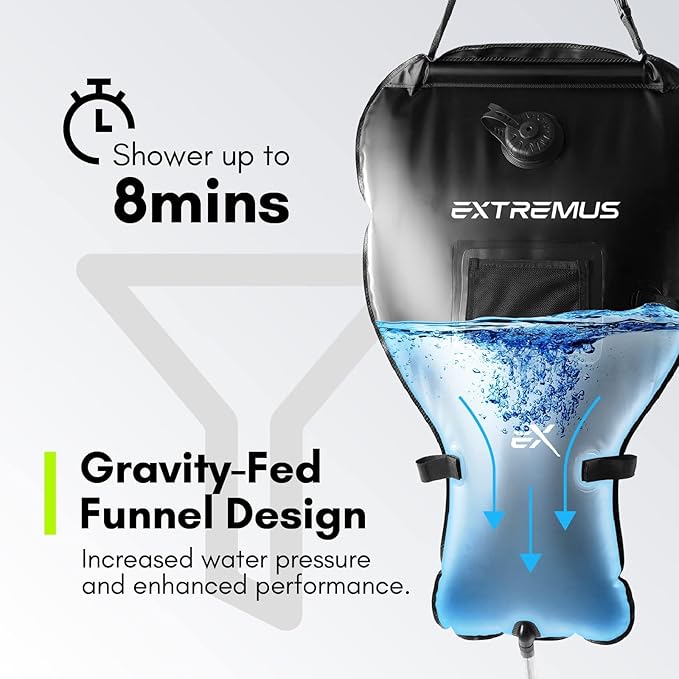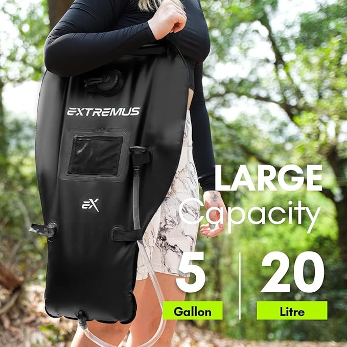 - Portable and Practical: The Extremus Portable Camp Shower is the perfect companion to make you feel right at home and one with nature. The portable design folds up to fit easily with your gear. Simply fill with water, hang in an area with plenty of sunshine, and enjoy a warm shower easily!
