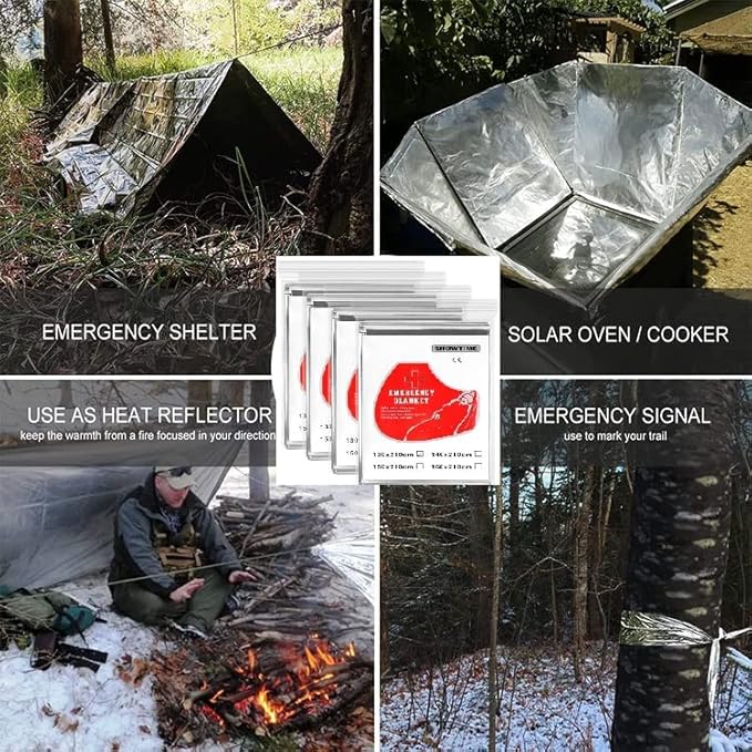 - ✅ MULTIPURPOSE SURVIVAL THERMAL BLANKET: Perfect for waterproof, moisture-proof, UV-proof with high low temperature resistance protection. It is very suitable as a outdoor gear for both men and women for such activities as hiking, camping, backpacking and mountaineering. These mylar thermal blankets can be used as ground covering, sleeping bag liner, emergency poncho, tent car blanket camping tarp survival against wind rain cold heat dirt dust...