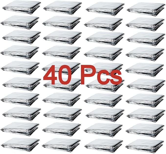 GALAXYLENSE Emergency Mylar Thermal Blanket for Survival First Aid Kits Army Outdoors Hiking Camping Bug Out Trauma Desert All Weather Condition Protection (40 Packs Silver)