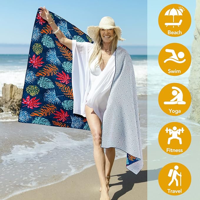 - 【Sand Free】The beach towel can be directly covered on the sand or grass, when not in use you can quick shake off the sand due to the smoother surface. What’s more, the microfiber beach towel is also soft and comfortable to touch.