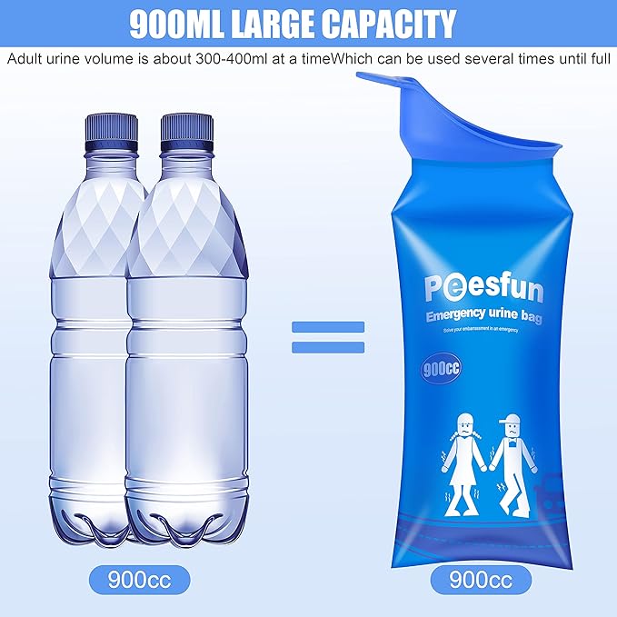 - 【Safe, non-toxic, and easy to use】The urine bag is made of safe and non-toxic high-quality materials, which will not irritate and harm the skin, ensuring a clean and comfortable experience, just open the emergency portable urine bag and use it without taking it out The white absorbent powder in the urine bag can turn the urine into a gel within 30 seconds and lock the odor. It can hold up to 900ml capacity. After use, please seal it and throw it into the trash.