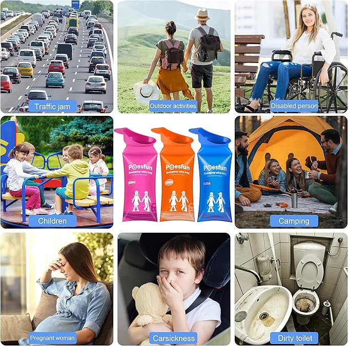 - 【Multipurpose Emergency Urine Bag】Suitable for traffic jams, camping, long-distance travel, pregnant women vomiting, hiking, fishing, mountaineering, kayaking, cycling and other outdoor activities, can be used as a vomit bag and emergency urine bag when mobility is limited. Disposable travel urinal bottle, perfect for adults, seniors, babies, pregnant women or patients in need.