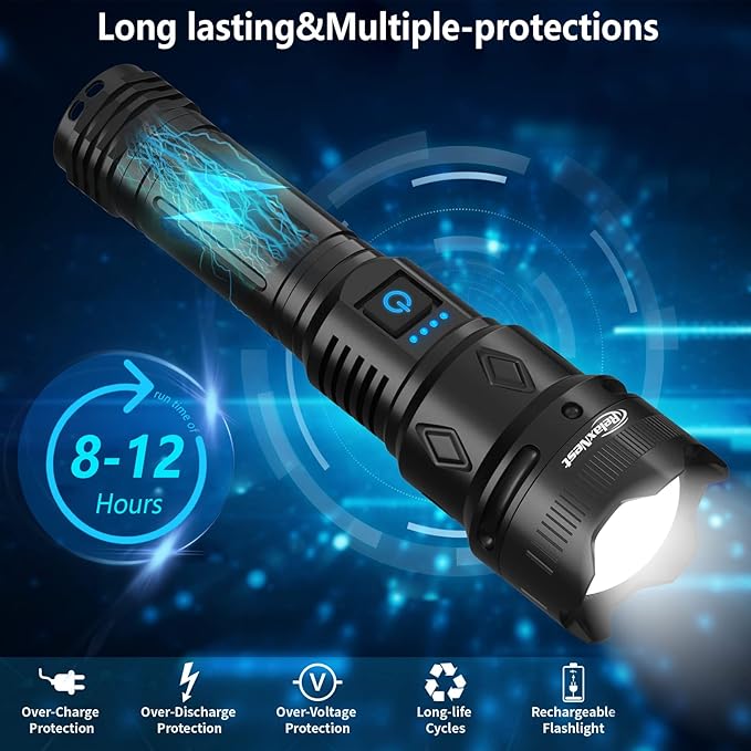 - Powerful Rechargeable Flashlight & Smart Power Display : This super bright rechargeable flashlight has a high-capacity 5000mAh battery and a fast-charging slot. It can be rechargeable more than 150000 times. The endurance time can be known in real-time. When the electric quantity is in sufficient, the flashlights can be charged in time.