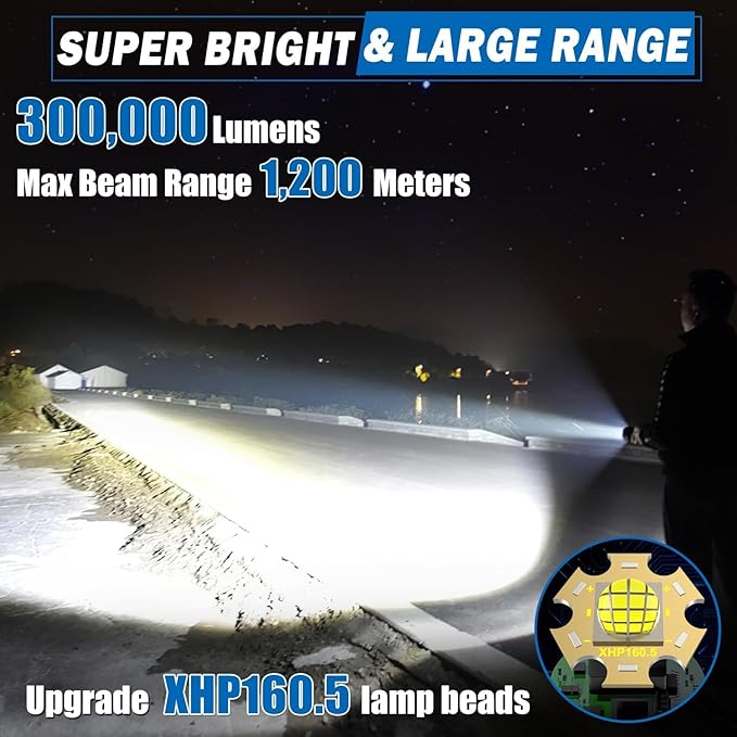 - Upgraded XHP160 Flashlight High Lumens : RelaxNest world's brightest flashlight high powered upgraded LED xhp160 chip that allows it to produce to 300000 lumens of light. With high powered flashlight, meeting your various illumination needs, lighting up to 1500ft² area or 3000ft distance, for emergencies, camping, hiking, home.