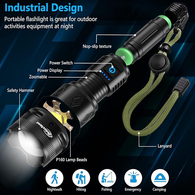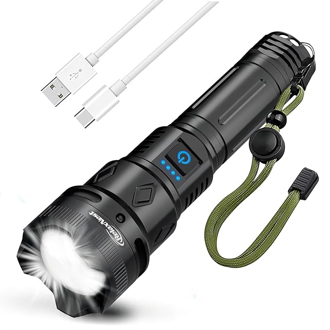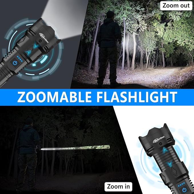 Rechargeable Flashlights High lumens, Powerful 300000LM Tactical Flashlights, 5 Modes LED Flashlight Zoomable, Brightest Flashlight Waterproof, Handheld Flash Light for Home, Emergencies, Camping