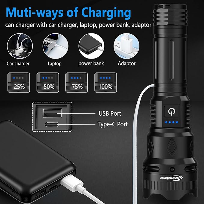 - What You Get : 1*xhp160 led flashlight, 1*USB Type-C Charging Cable, 1*5000mAh Rechargeable Battery, 1*3A Battery power sleeve. And we provide 30 days of money back for no reason, 12 months manufacturer warranty, and lifetime friendly customer service.