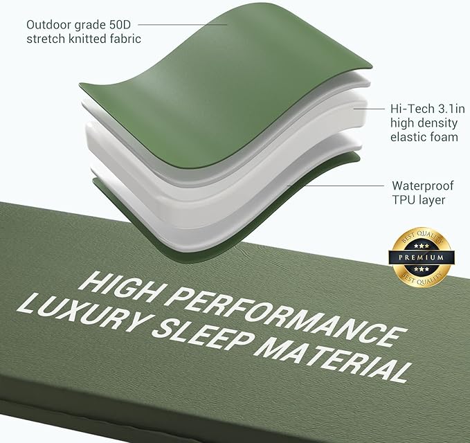 - Hi-Tech Memory Foam Sleeping Pad: Elegear self inflating sleeping pad features Hi-Tech memory foam with a density of 26D while other camping pads only have a density of 19D. Hi-Tech foam with high resilience can greatly distribute weight evenly and relieve body pressure at the different contact points of the camping mattress pad, create incredible softness and support. The elaborate Hi-Tech foam is only for you to experience the ultimate comfortable sleep and enjoy five-star hotel-level comfort.