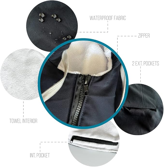 • ✨ PRACTICALITY: The sport cape folds and is easily stored, it’s practical to take it anywhere. The swim tech coat has one pocket on each side to store whatever you need, an inner pocket with zipper, a hoodie to dry the hair and protect the head from the wind, zipper and a tri layer fabric part (from waist to knees) at the back so you can sit without wetting any surface.