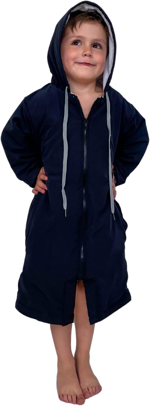 • ✨ PRACTICALITY: The sport cape folds and is easily stored, it’s practical to take it anywhere. The swim tech coat has one pocket on each side to store whatever you need, hoodie to dry the hair and protect the head from the wind, zipper and a tri layer fabric part (from waist to knees) at the back so your child can sit without wetting any surface.