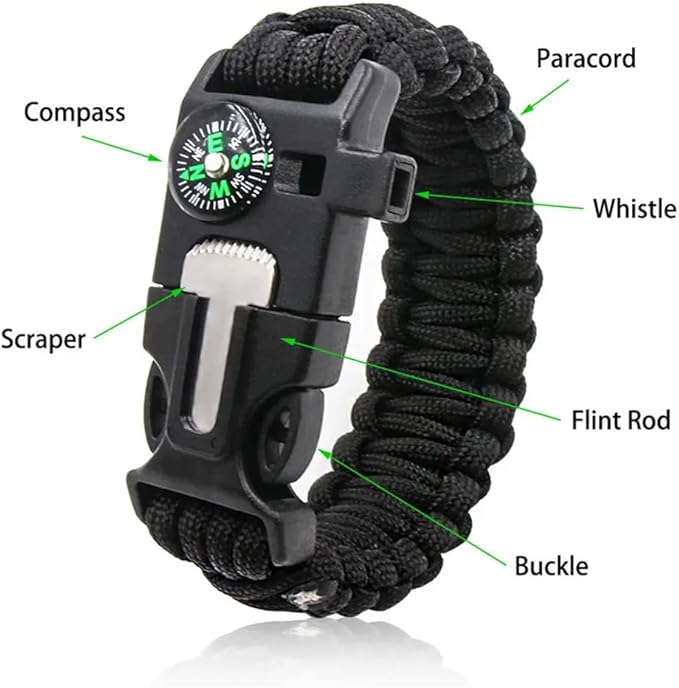 - Survival bracelet includes a paracord, a built-in whistle, compass and mini ferro rod