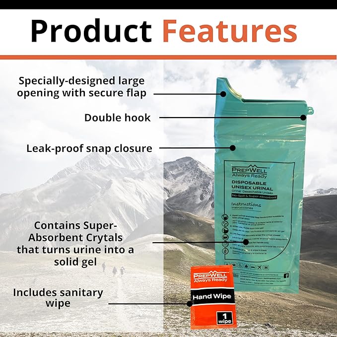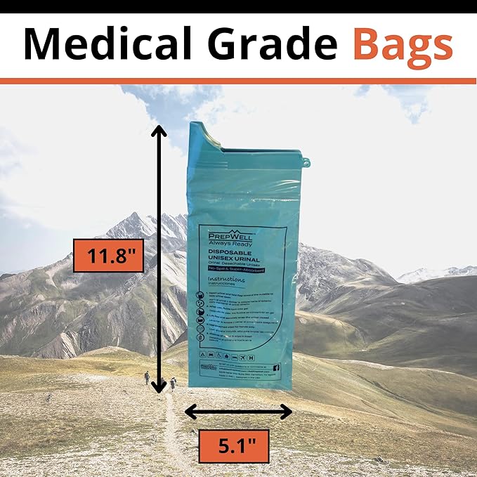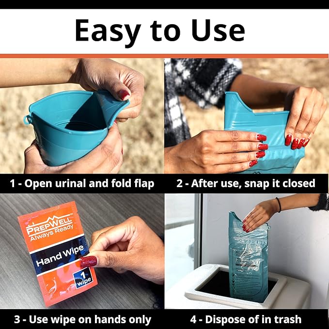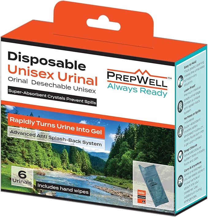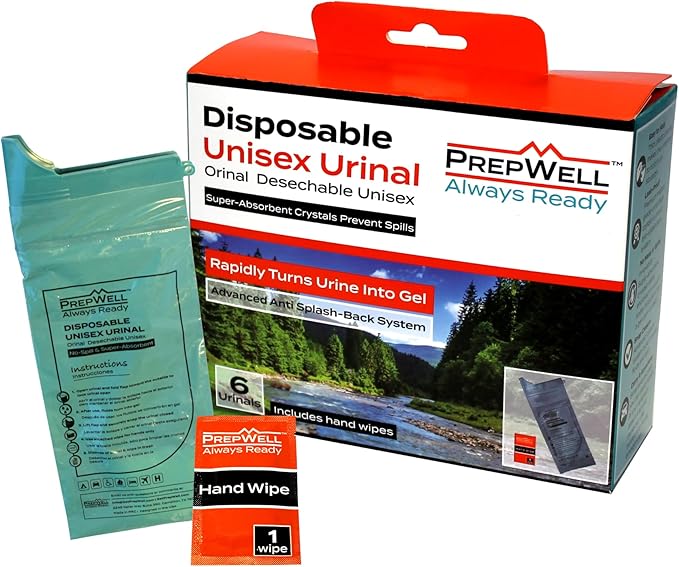 Prepwell Disposable Unisex Urinal Bags- Immediately Turns Urine into Gel with Super Absorbent Crystals to Prevent Spills- 6 Urinals with Hand Wipes Included