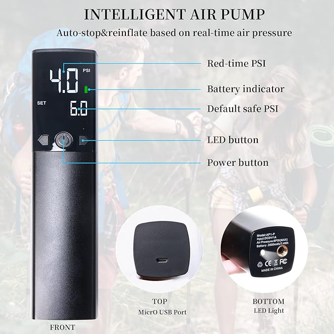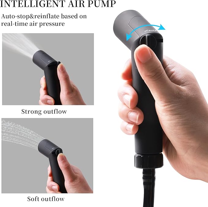 - 【★Rechargeable Air Pump★】Our camping shower equipped with rechargeable air pump, press the power button, hook it up to the shower bag, and let it do the rest. Equipped with an intelligent pressure monitoring system, which stops pumping when the pressure of the shower bag reaches 6.0 PSI and automatically starts pumping when the pressure is lower than 4.0 PSI. You don't need to operate again, so you can take the shower safely