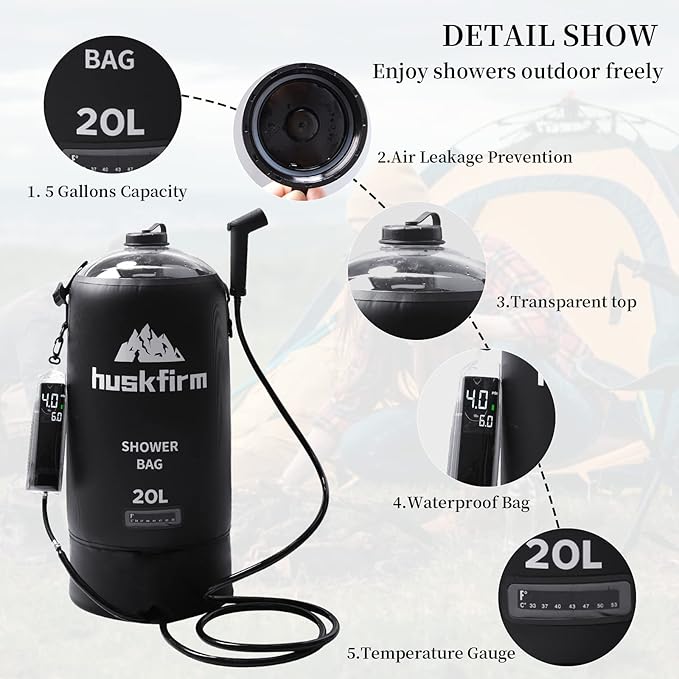 - 【★Use anytime and anywhere★】We have reinforced the base of the shower bag in the camp. The shower bag can stand steadily on the ground, even if it is full of water, it will not dump, and it doesn't need you to hang it at a high place