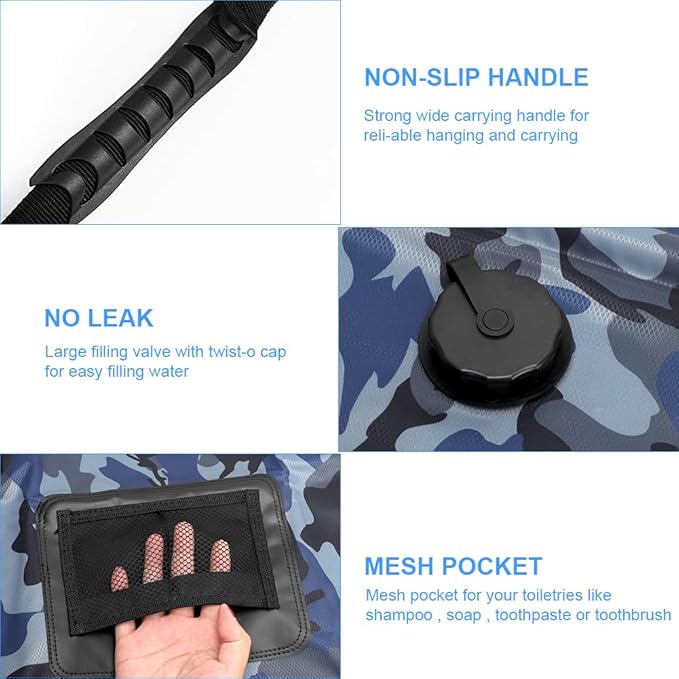 - 【High Water Capacity】This camping shower bag can carry up to 5 gallons water for showering outdoor,let you enjoy a better and refreshing shower anywhere.