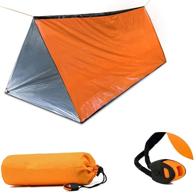 1 Piece Survival Shelter, Polyester Film Emergency Tent Survival Kit with String Bundle Pocket Whistle for Hiking, Car Camping, First Aid Hurricane