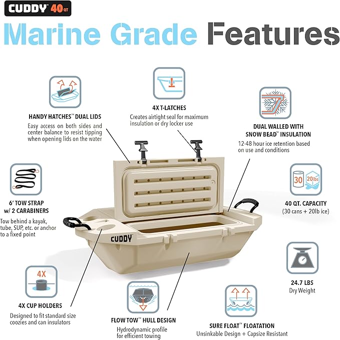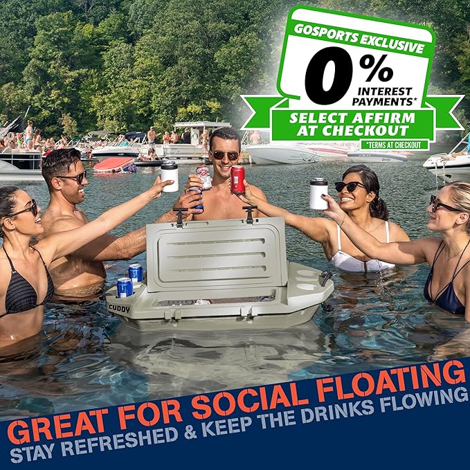 - SOCIAL FLOATING: Always have your cold drinks within reach, in and out of the water; Easy cooler access with 2 large lids and 4 built-in cup holders; Anchor your CUDDY on the sandbar, tie-off on your boat or tow behind your kayak