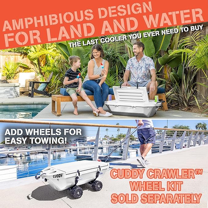 - AMPHIBIOUS FLOATING COOLER: Float, tow or anchor, the CUDDY is a floating cooler and dry storage vessel that also serves as a traditional cooler on land; Always have your drinks or gear within reach while on the water