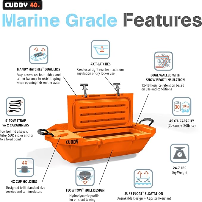 - SOCIAL FLOATING: Always have your cold drinks within reach, in and out of the water; Easy cooler access with 2 large lids and 4 built-in cup holders; Anchor your CUDDY on the sandbar, tie-off on your boat or tow behind your kayak