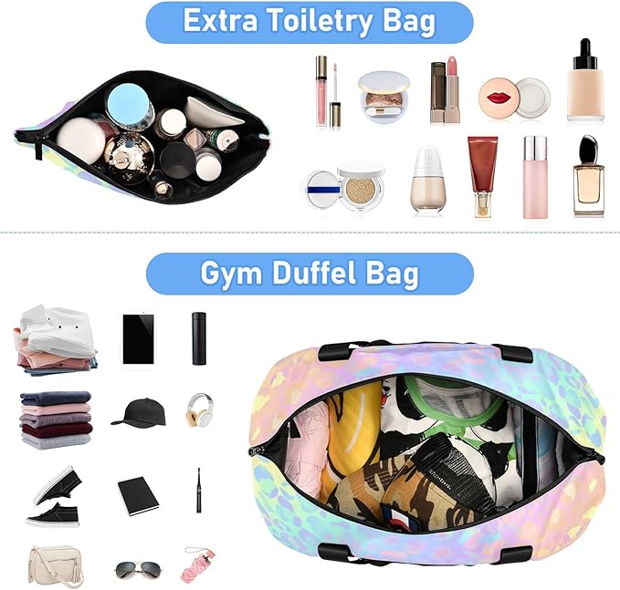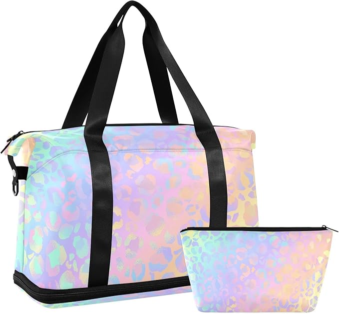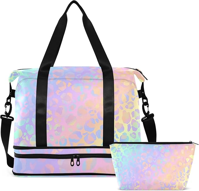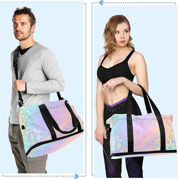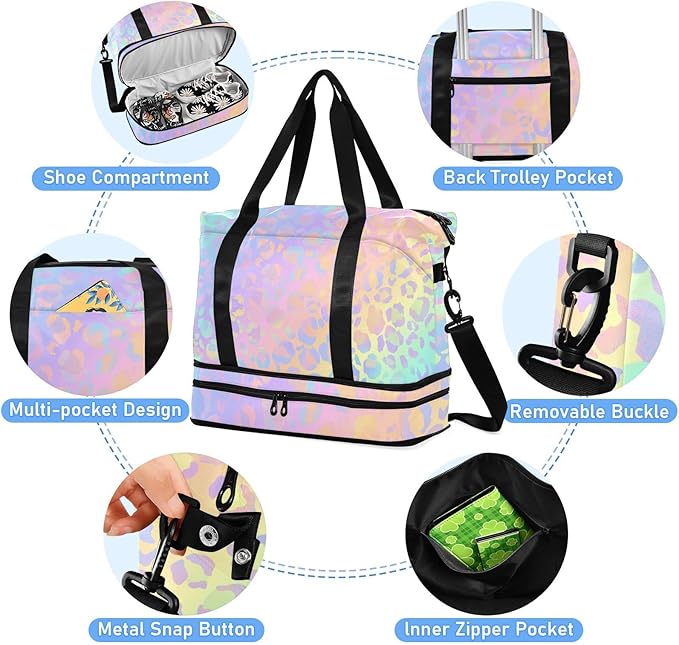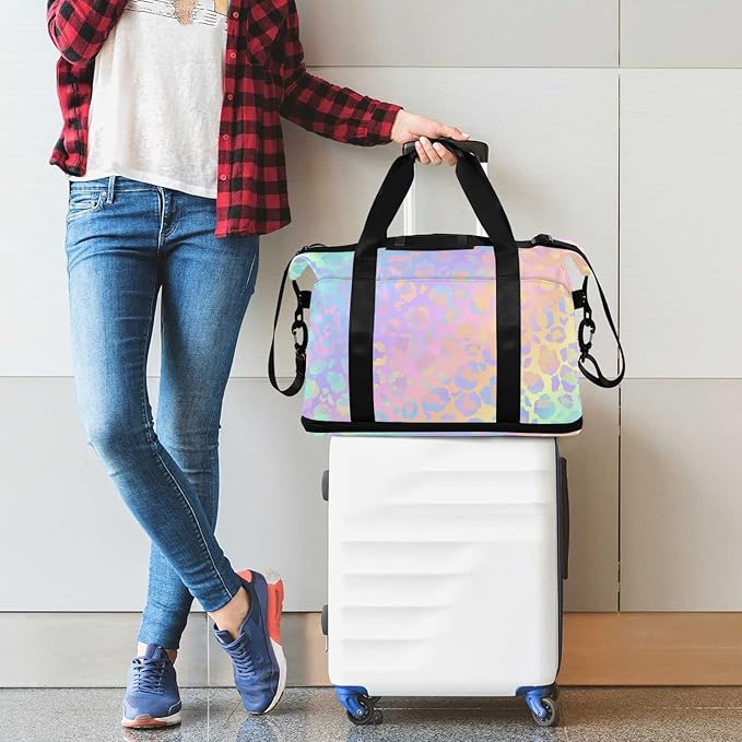 Rainbow Leopard Print Gym Bag for Women - Neon Sports Duffle Travel Tote with Toiletry & Shoes Compartment, Dry/Wet Separation Swim Bag