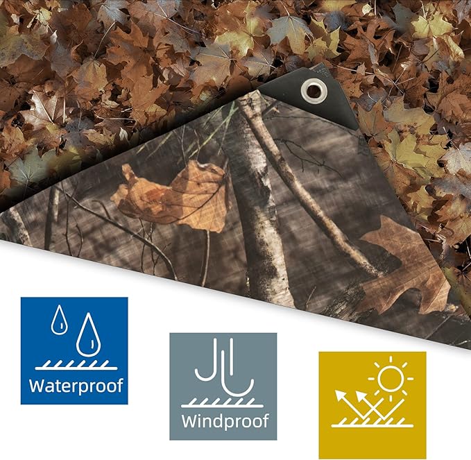 - High Qualtiy Fabric: Tongcamo tarp is made of high-density, tightly woven, made-to-last polyethylene fibers, UV protection against harmful sunrays and fading, waterproof, sunproof and windproof, can be applied to rain, shine, snow or wind all seasons. It has the strength, durability, woven tightly together and the plastic is laminated. The Tree Camo Tarpaulin has a 11 mil thickness, 5 oz. per square yard, and a 12 x 14 weave count.