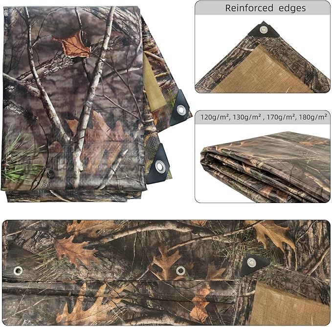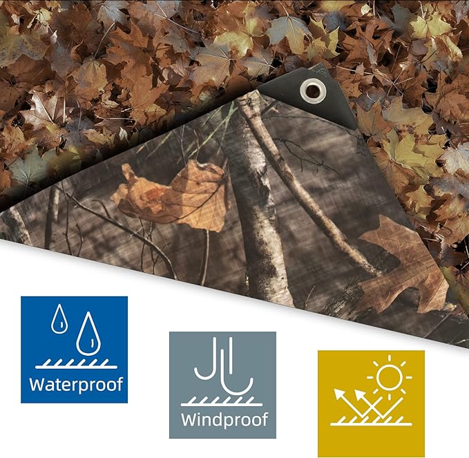 - High Qualtiy Fabric: Tongcamo tarp is made of high-density, tightly woven, made-to-last polyethylene fibers, UV protection against harmful sunrays and fading, waterproof, sunproof and windproof, can be applied to rain, shine, snow or wind all seasons. It has the strength, durability, woven tightly together and the plastic is laminated. The Tree Camo Tarpaulin has a 11 mil thickness, 5 oz. per square yard, and a 12 x 14 weave count.