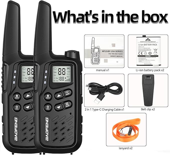- Included Components : 2XBelts&1XManual, 2XRadio, 2XLanyards, 1X 2 in 1 Type-C Charging Cable, 2XBatteries