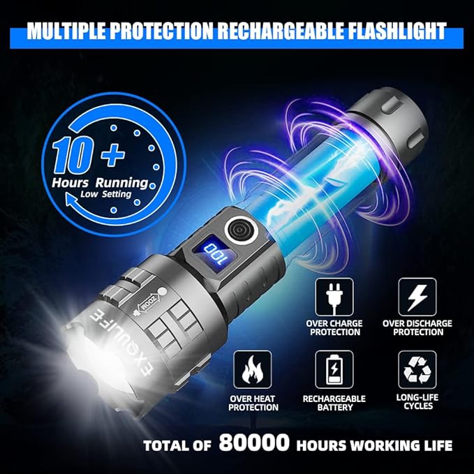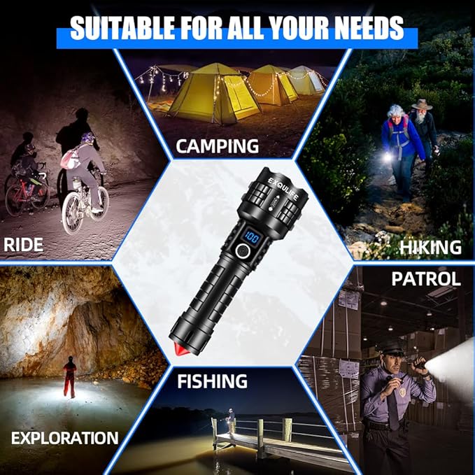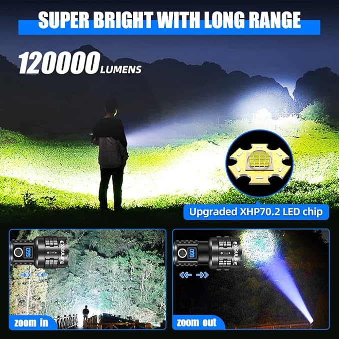 - 120000 Lumens Super Bright: Exqulife rechargeable super bright flashlights has a powerful 120000 lumens ultra-wide beam, thanks to the updated XHP70.2 LED chip embedded. It is brighter than basic LED flashlight and easily illuminates 125 sq. ft. area.