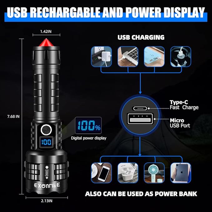 - USB Rechargeable & Power Display: Comes with built-in USB cable input port, this rechargeable flashlight can be easily charged by power bank, computer, car charger, wall charger, etc. Meanwhile, it can also be used as a power bank to charge your phone, computer, etc. in an emergency. The LED digital power display helps you clearly understand the battery usage.