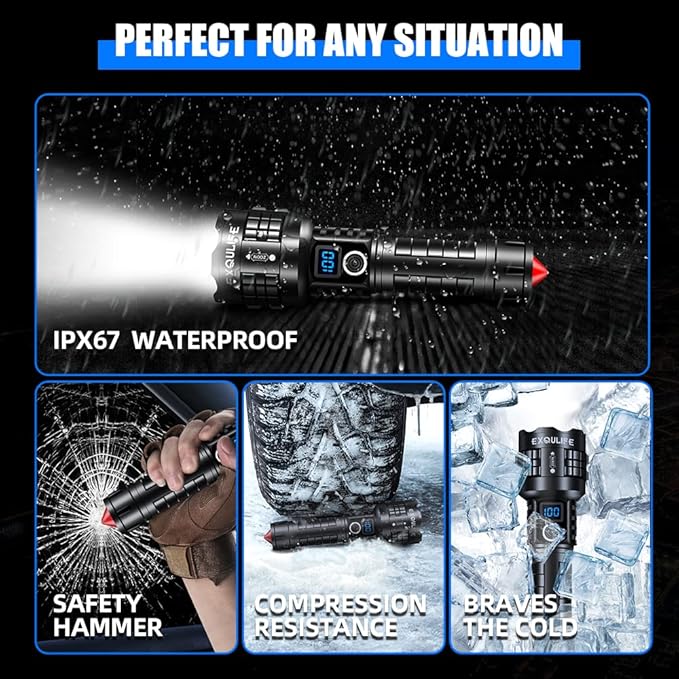 - IPX67 Waterproof & Indestructible: Comes with IPX67 Waterproof, this powerful flashlight is still available even if it is temporarily placed in water. In addition, extreme conditions such as freezing and being compressed by truck still cannot prevent it from working properly.
