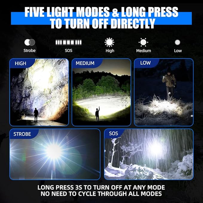 - 5 Light Modes & Long Press to Turn Off: The powerful flashlight has 5 modes including High-Medium-Low-Strobe-SOS for your different needs. Fortunately, you can also press and hold the button for 3 seconds to turn off the led flashlight without cycling all light modes.