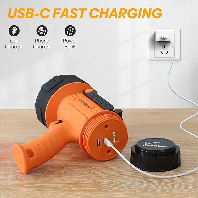 - [High-Speed Charging] This 200000 lumens hand held spot lights comes with 1.2m Type-C cord, Charge phone at high-speed via the 18W USB-C port, or get a powerful charge for tablets and other mobile devices via the 18W USB-C port.(Adapter not included)