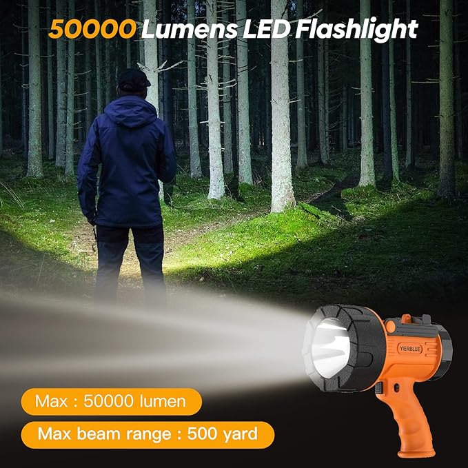 YIERBLUE Rechargeable Spotlight, Waterproof Handheld Flashlight, 200000 Lumens LED, 10000mAh Battery, IP67 Waterproof, 3 Adaptable Settings, 18W USB-C Port
