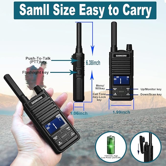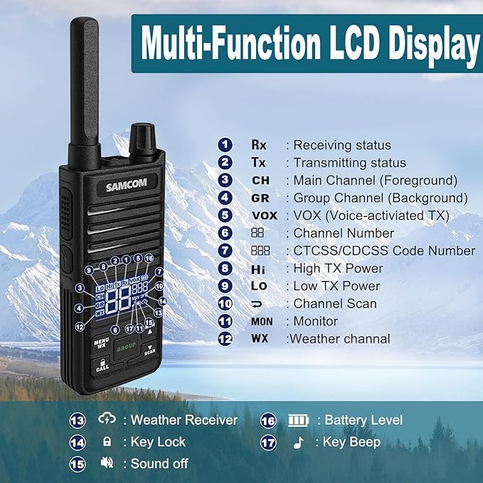 - 【Multi-Function GMRS Long Range Radios】- NOAA feature automatically scans and receives weather reports from 11 weather channel, letting you know when bad weather is coming. SAMCOM T2 GMRS walkie talkies also has built-in LCD screen and flashlight, 3 VOX Levels, keypad lock, PTT button, channel scan and other functions