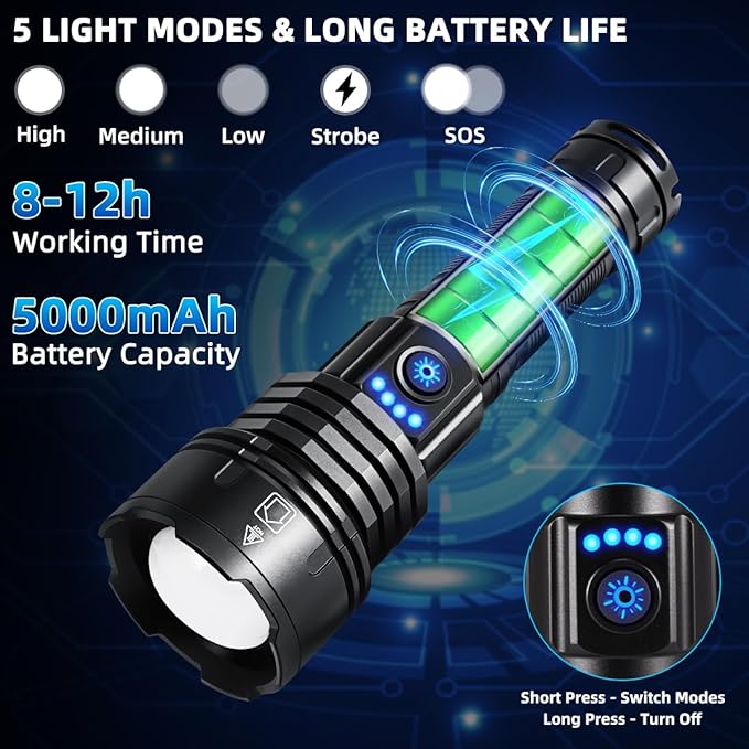 - Adjustable Focus & 5 Modes: Powerful flashlights have 5 modes: High / Medium / Low / Strobe / SOS, which can be switched by pressing the power button. According to your needs, you can stretch the head of bright flashlight to change the focal length and beam size, and freely choose long-distance observation and wide-range lighting.