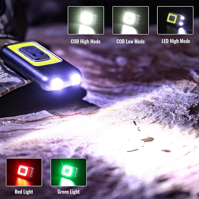 - 【5 Versatile Light Modes】Our running flashlight offer 5 different light modes to cater to your specific needs. From the powerful side COB High Mode, side COB Low Mode, to the front LED High Mode and the convenient red and green lights, this rechargeable jogging lights has got you covered. The red and green light design is perfect for seeking help in emergency situations. Whether you're jogging or camping, this night wearable light is the ultimate companion you can rely on.