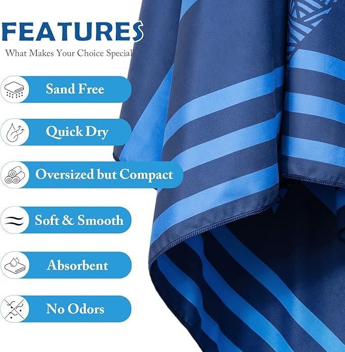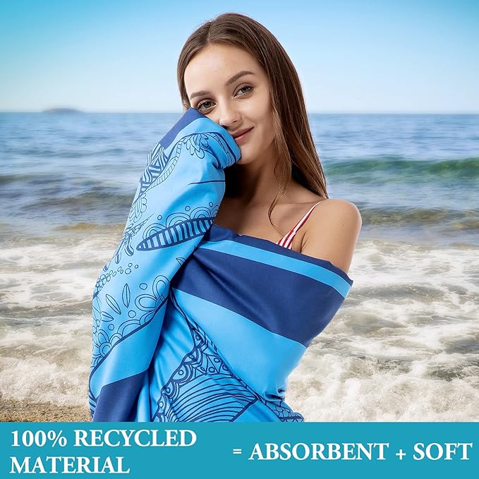 - 🔵 QUICK-DRYING & SUPER ABSORBENT - Our quick dry beach towel which dries three times faster than a standard cotton towel and will stay free of unpleasant damp smells. In addition, our towels are super absorbent. The fibers will soak up all water and moisture off of you in no time, leaving you dry and ready to go.