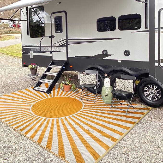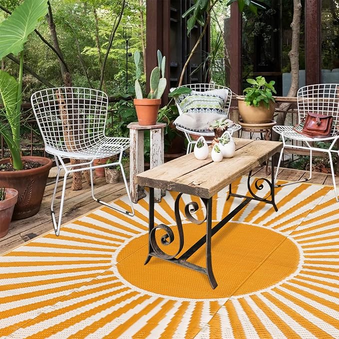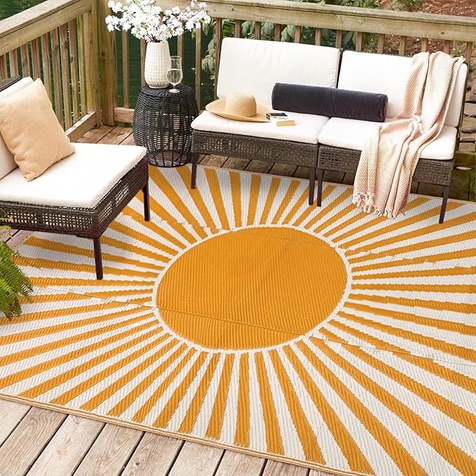- [Versatile Outdoor Rug] The large outdoor rug is woven from a breathable, comfortable plastic material that won't damage your deck or lawn. Ideal for patio, deck, garden, backyard, balcony, camping, picnics, tent, RV road trips, beach and indoor rooms