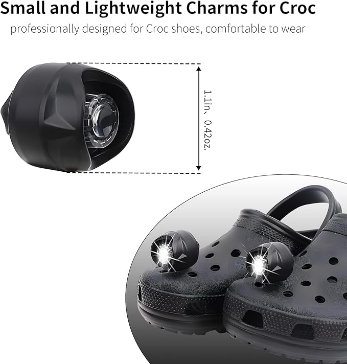 - Small & Lightweight: lights for croc shoes is made of sturdy ABS plastic, which is lightweight and durable, you won't even feel the weight of it on your feet when you wear it. It can be used as an emergency light alone, suitable for kids and adults