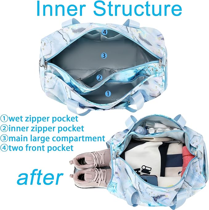 - Gym bag with shoe compartment to keep your sneakers and dirty gear separated, as well a zipped plastic wet pocket for bathing suits or travel toiletries