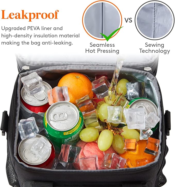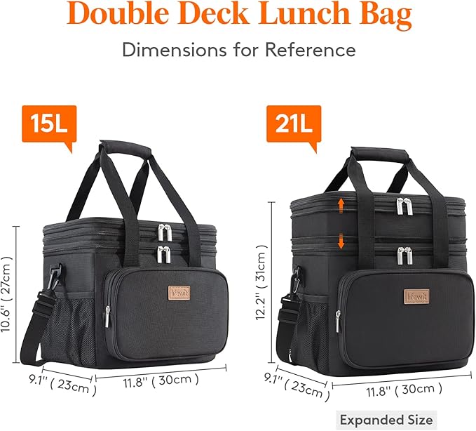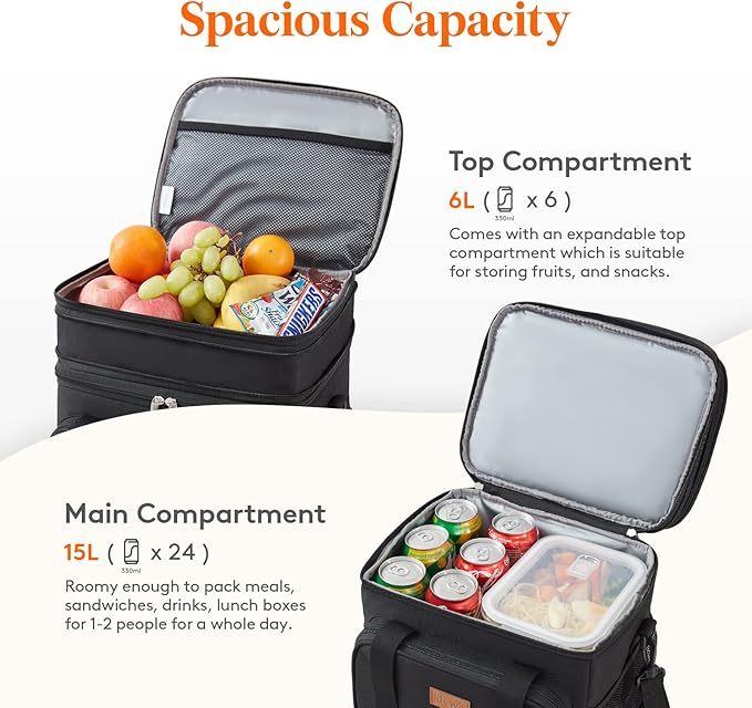 - Spacious Capacity: Measures 11.8" x 9.1" x 10.6" with a 15L capacity, fits 24 cans of 330ml coke. The expandable top compartment adds 6L of space, increasing the total capacity to 21L and fitting 30 cans of 330ml coke. Expanded size: 11.8" x 9.1" x 12.2". Ideal for packing meals, sandwiches, snacks, drinks, fruits, and lunch boxes.