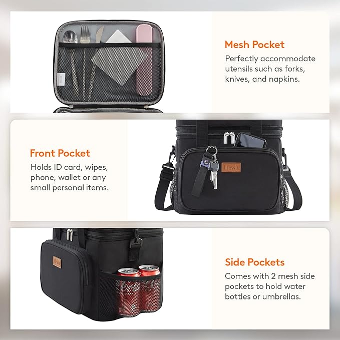 - Multiple Pockets: This lunchbox for adults features a main compartment for drinks or food, a top compartment with a mesh pocket for fruits and snacks, a front pocket for essentials like phone, wallet, and keys, and 2 mesh side pockets for small water bottles or umbrellas.